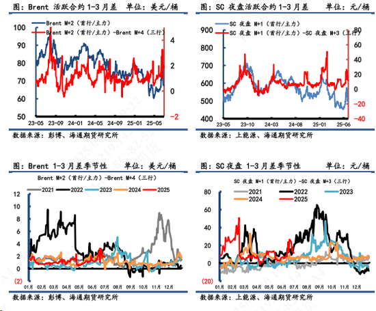 1) 价差:6月27日,SC 夜盘1-3月差为12.9元/桶,换算成1.80美元/桶;Brent 1-3月差为1.85美元/桶,WTI 1-3月差为2.55美元/桶。SC夜盘-Brent主力合约为1.61美元/桶,SC夜盘-WTI主力合约为4.21美元/桶。