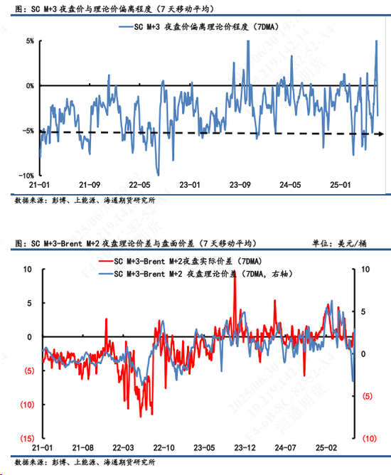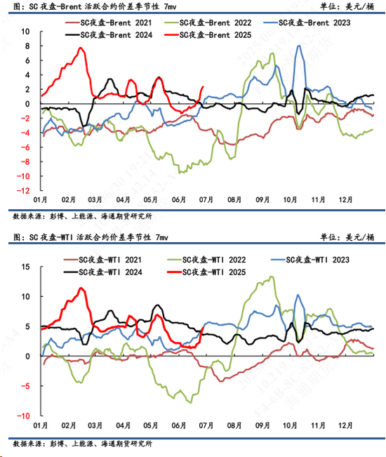 2)套利:①估值:6月27日凌晨2:30,Brent 2508盘面价为67.73美元/桶,SC 2509盘面价为489.8元/桶,测算SC 2509盘面理论价为503.5元/桶,当天盘面估值偏离程度-2.71%。从7天移动平均估值值中,以【-5%,0】为正常区间来看,目前仍处于合理估值范围内。由于6月13日之后地缘爆发升级造成的估值大幅脱离程度已然有所修正。②利润:测算SC2509盘面到岸利润-13.67元/桶,折合-1.91美元/桶。③价差:SC2509-Brent2508盘面差为0.56美元/桶,理论差2.46美元/桶,盘面价差低于理论价差。(注:本周Brent首行为2508;SC首行为2508;其中M代表时下6月)